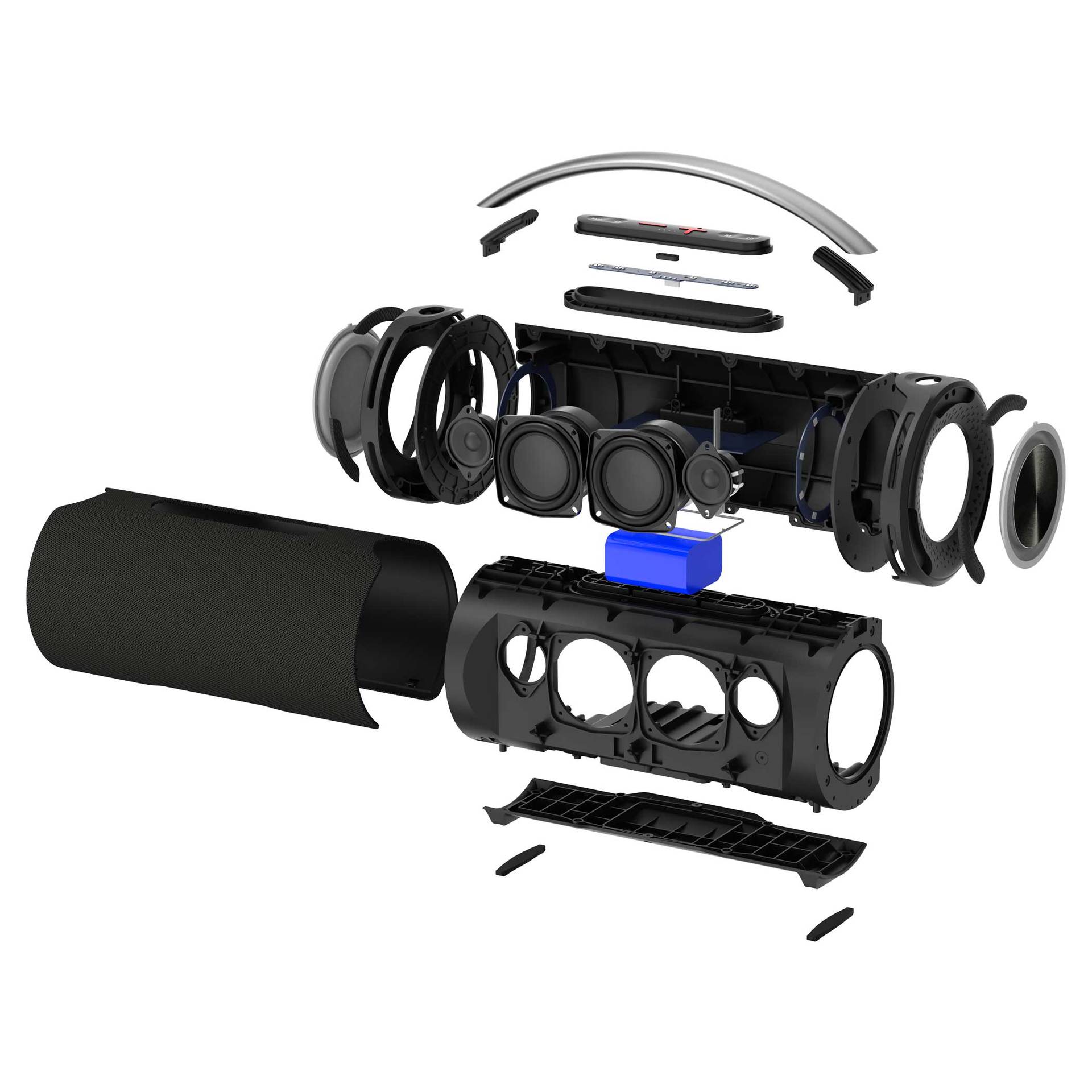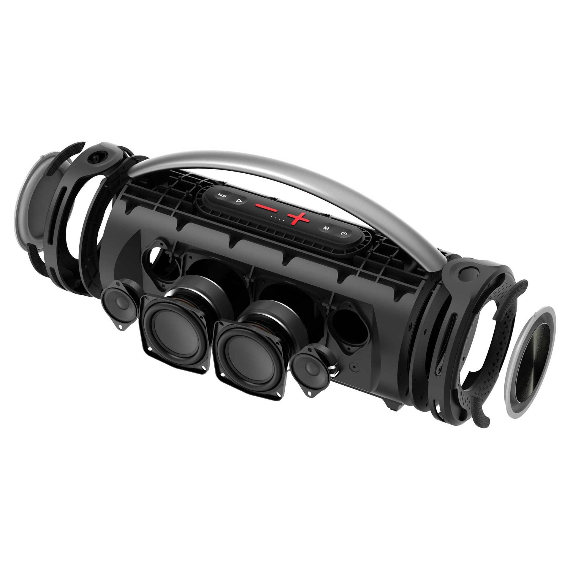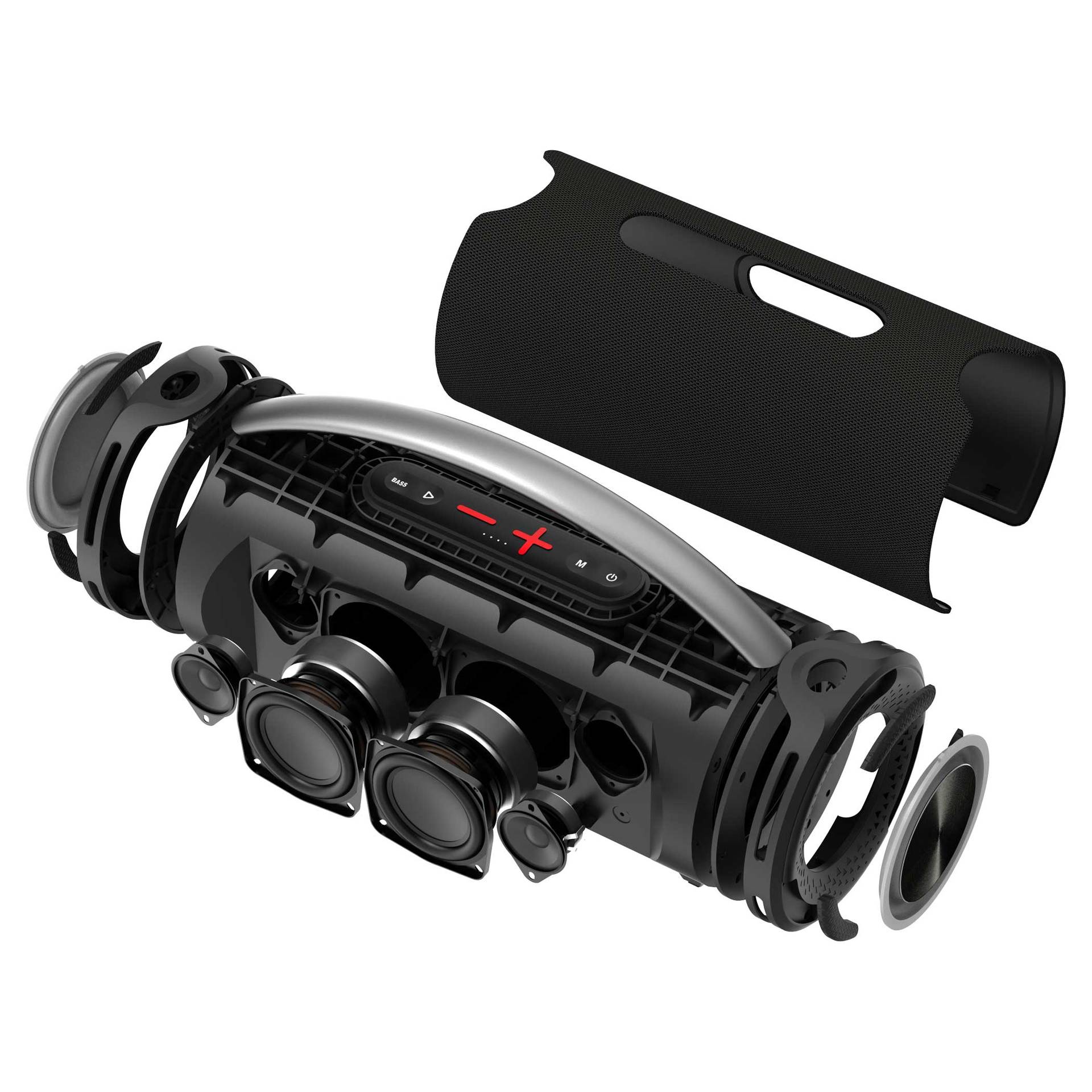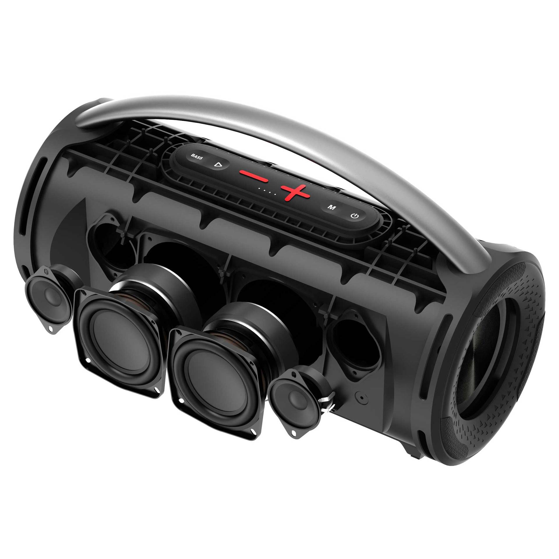 Konfigurace reproduktorů: 4 aktivní měniče + 2 pasivní zářiče