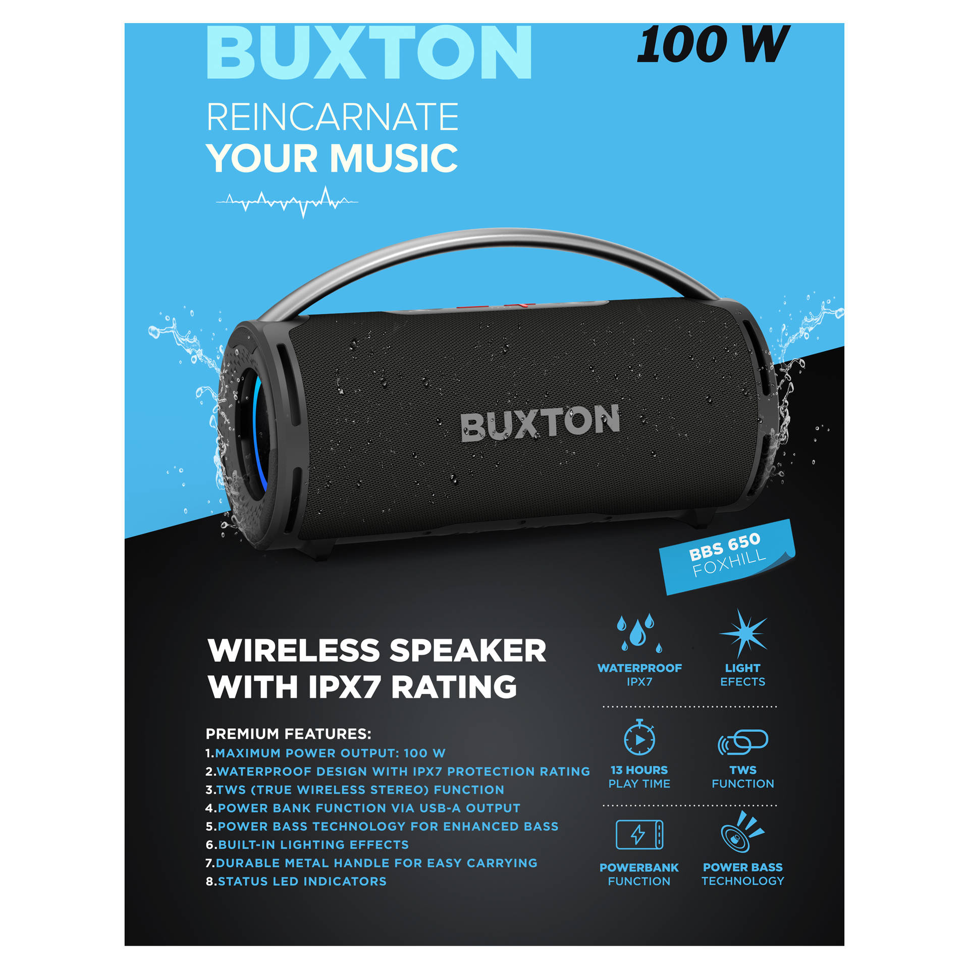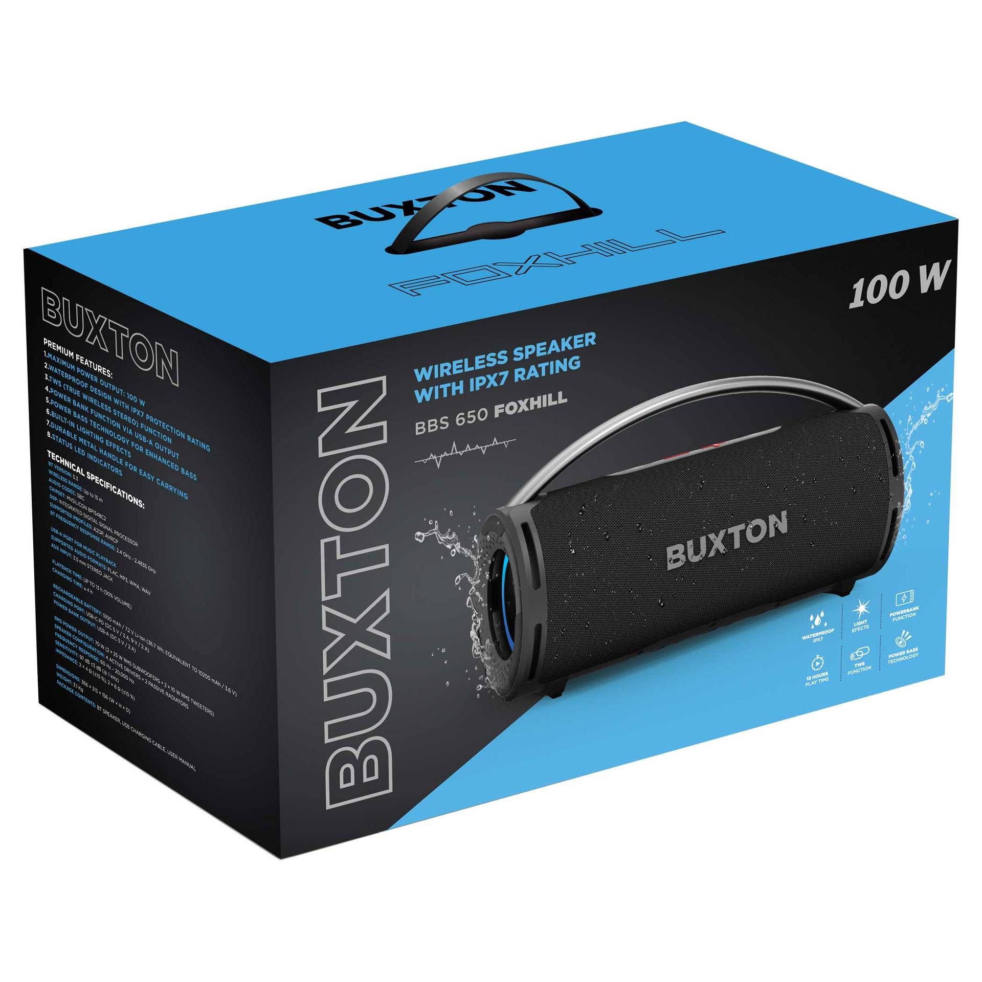 RMS výstupní výkon: 70 W (2× 25 W RMS basové reproduktory + 2× 10 W RMS výškové reproduktory)