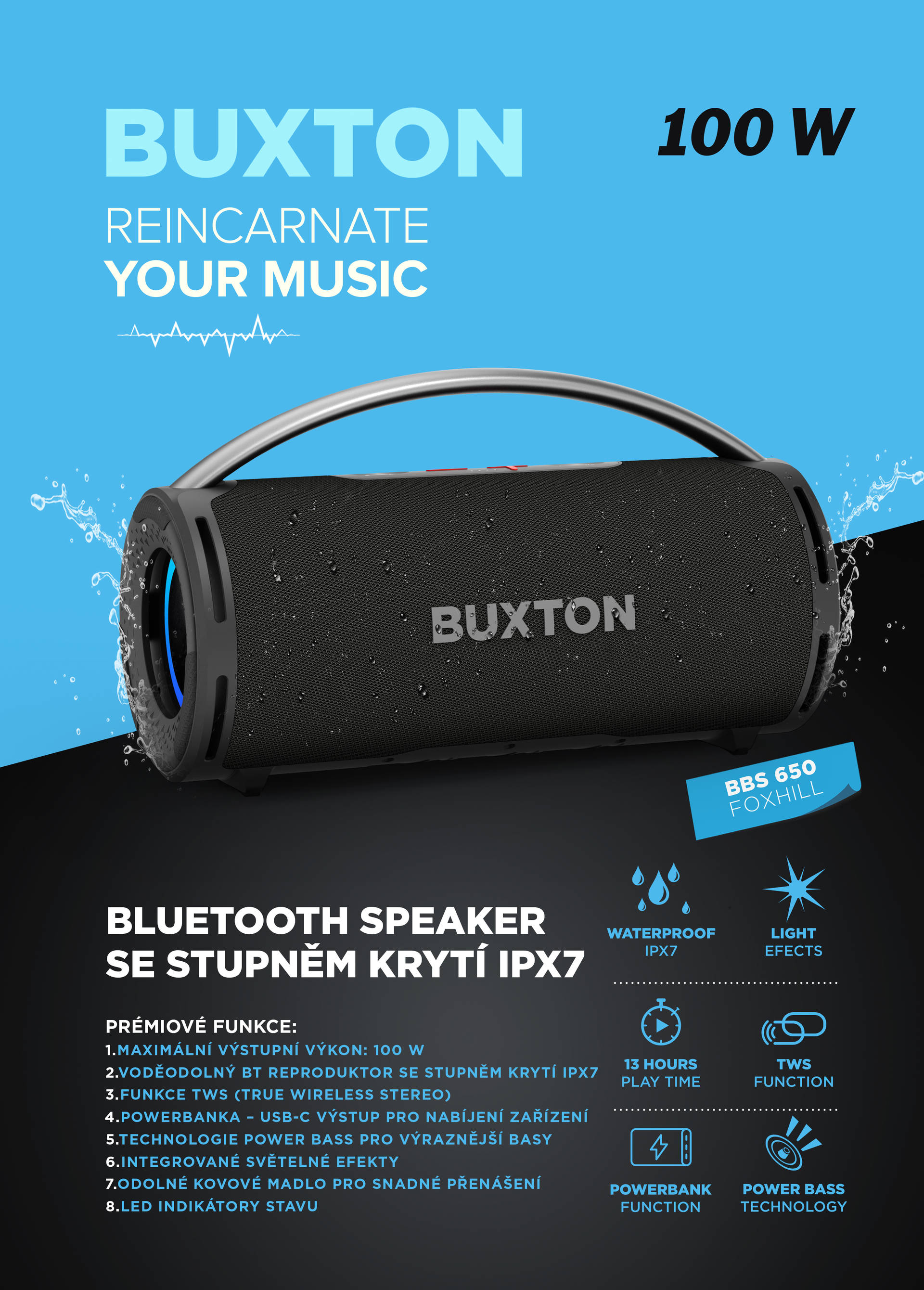 Obsah balení: BT reproduktor, USB nabíjecí kabel, uživatelský manuál